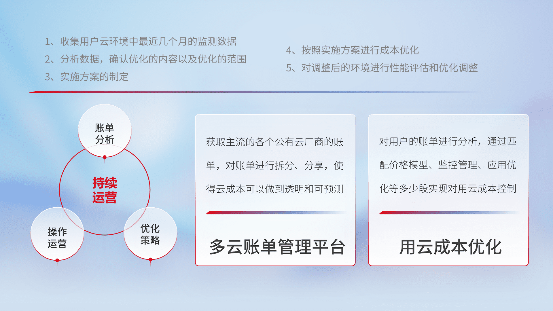 通过多云纳管,,,以统一的资源数据模型把客户的云资源进行抽象和封装,,,,进而实现对多云资源的统一操作,,,保障云资源管理的可靠性、、、稳定性与可用性。。。量身定制化运维内容,,配置、、开发运维、、、、补丁管理、、备份、、、监控、、、认证和访问管理、、、、审计和日常巡检等,,,,保障在用云过程中的可靠度,,,,稳定度以及高可用率。。。